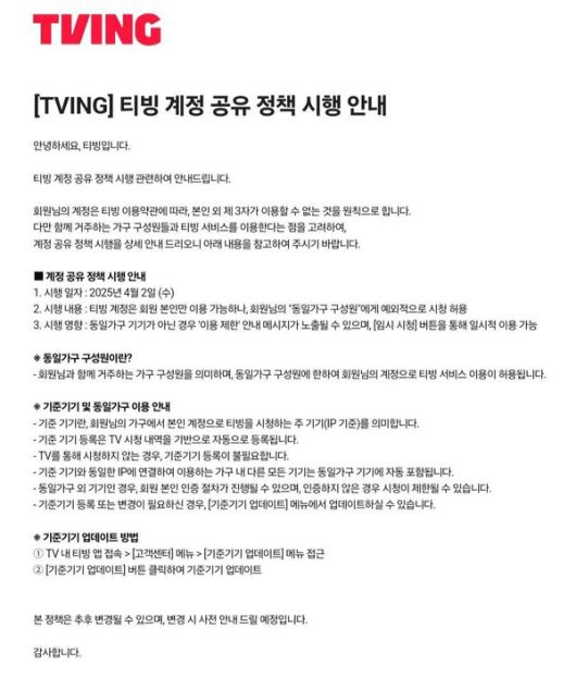 즉, TV를 통해 티빙을 시청하는 경우에만 계정 공유가 제한되며, 만약 다른 장소에서 다른 IP로 접속할 경우 본인 인증 절차가 추가로 진행됩니다. 이를 인증하지 못하면 시청이 제한될 수 있습니다. 다만, 모바일이나 PC를 이용하는 구독자들은 기준 기기 등록 대상에서 제외되어 이번 정책의 영향을 받지 않습니다.