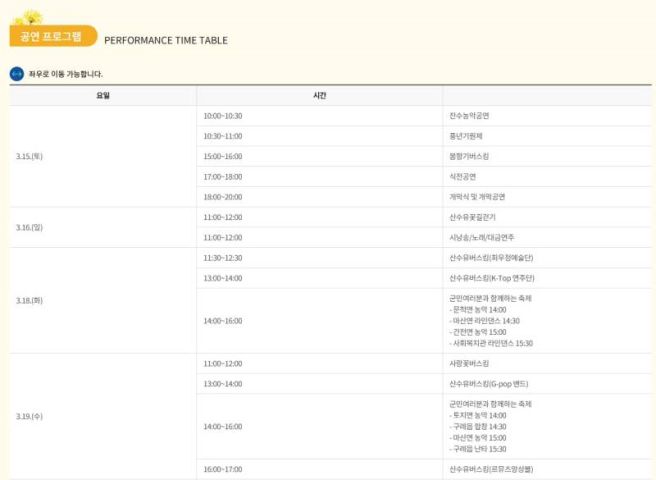 공연과 체험 프로그램은 참가자들의 만족도를 높이기 위해 매일 다양한 테마로 구성되어 있으며, 날마다 새로운 볼거리와 체험거리가 제공됩니다. 따라서 시간이 충분하다면 하루 종일 구경하며 다양한 이벤트에 참여해 보시기를 추천드립니다.